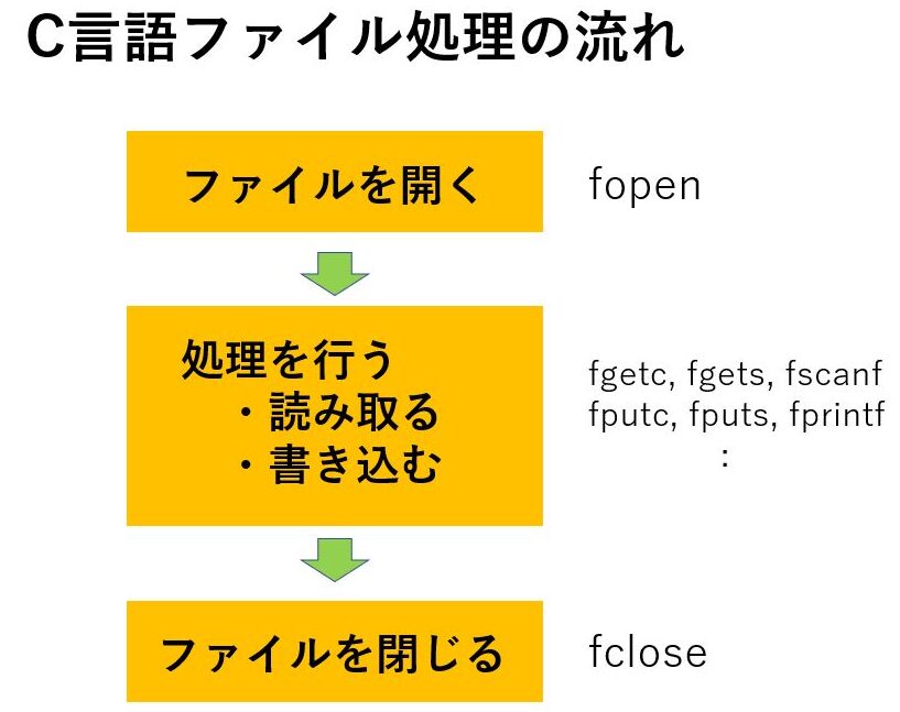 - ファイルを閉じる。 fclose関数を使用して、開いたファイルを閉じます。