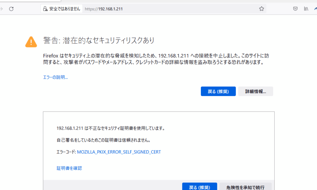 - ウェブサイトにアクセスする。 証明書エラーが表示されるサイトです。
