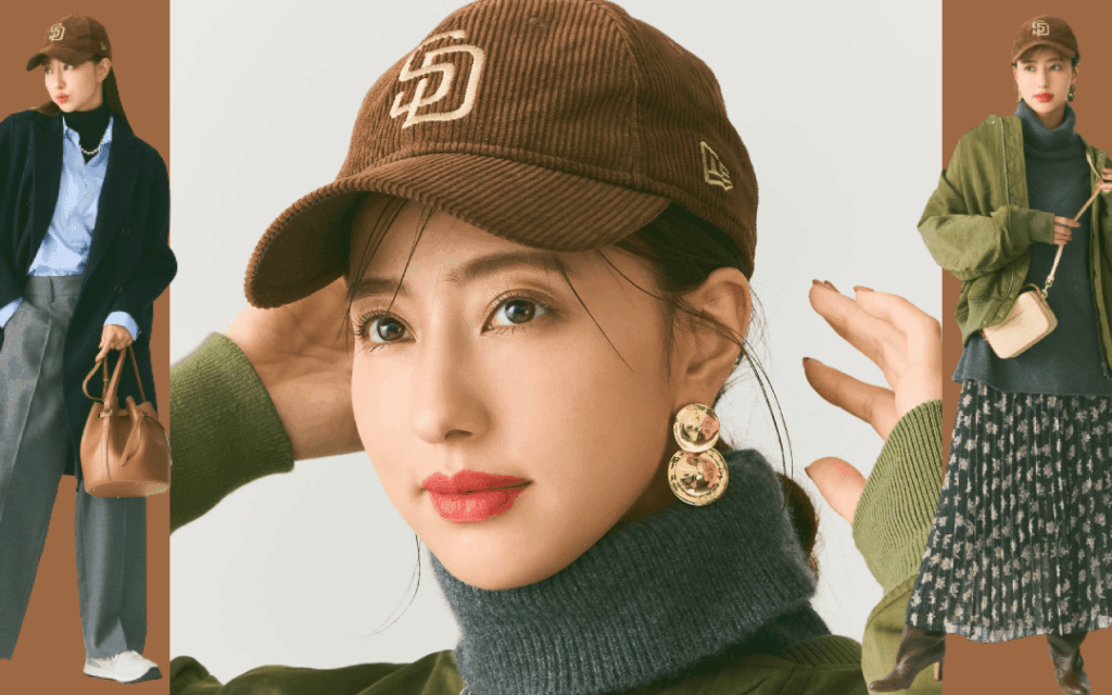 茶色のキャップとの組み合わせで、スタイルをさらにアップデートできる。具体的なアイテムを見てみよう。