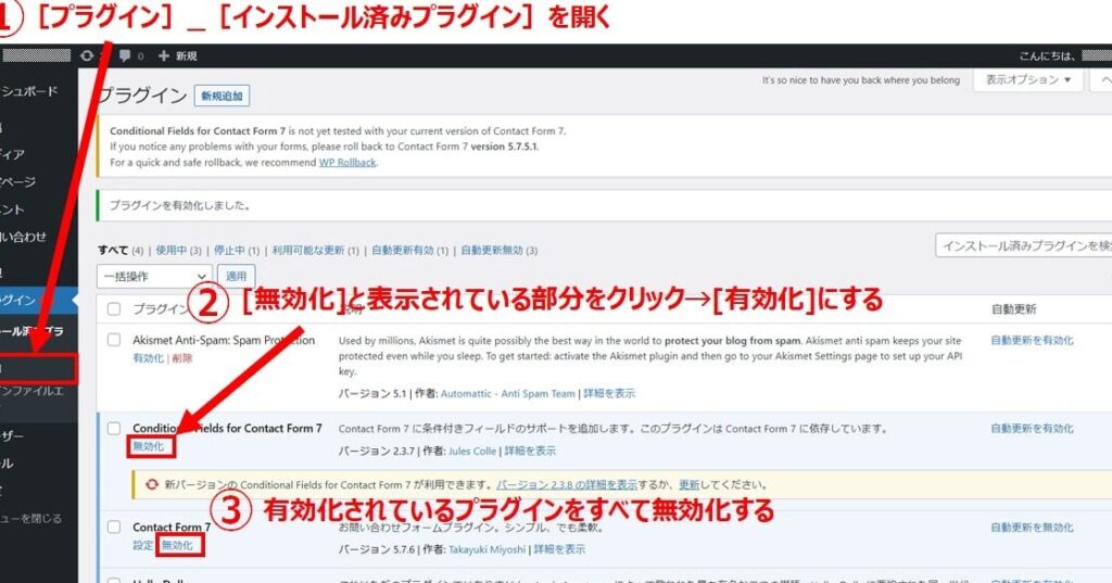 - プラグインの更新を行う。Contact Form 7や関連プラグインが最新バージョンに更新されているか確認し、必要に応じて更新します。